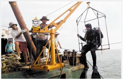 图③ 领队周春水亲自使用自己设计制造的潜水员起吊设备。