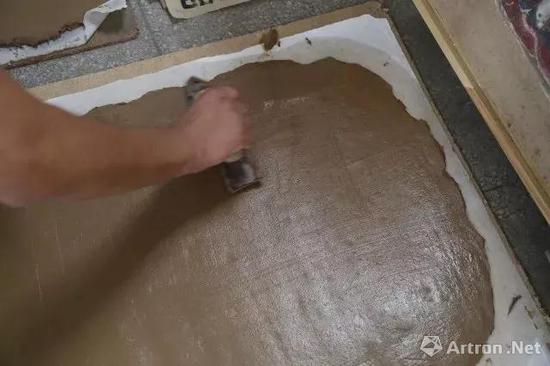 “敦煌壁画基底层是在酒泉系的砾岩上,石壁凿成后直接墁上一层掺有麦草的粗泥,待半干后再加掺有麦草或麻筋的细泥,最上面墁上一层薄如蛋壳般的粉皮。”根据原洞窟的色彩分析,北壁龛楣绘制于含高岭土、白垩等成分的白粉层之上。为了营造出壁画的层次感,在纸本上要做出泥底的墙壁质感,通常会在刷过胶矾水熟制后的纸本上进行泥底和白粉层的制作。