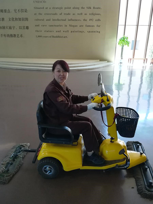 张跟弟特别喜爱自己的工作,工作的时候,心情都是快乐的。她与同事如果谁提前完成了工作,大家会互相帮忙。莫高窟数字展示中心矗立在沙漠的边缘,整个场馆内却是一尘不染。“眼快,腿快,手快”是保洁员的行动准则,他们会在第一时间把问题解决掉。曾经有个一线城市来的女游客,专门带包零食去卫生间拍照留念,称莫高窟的卫生间是她见过最干净的卫生间。