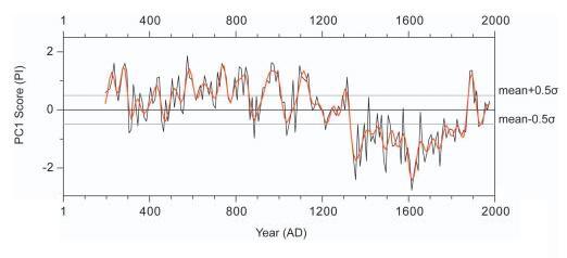 那么,在西风模式的框架下,依靠中国北方农耕区的降水重建结果,可以推测出在中国历史上其他几次游牧民族扩张的气候背景。研究者们综合利用历史文献、树轮和石笋等代用证据重建出中国北方季风区过去1800年的干湿状况,我们看到汉末至南北朝时期中国北方整体偏湿,而在310年、340年和460年分别有三次10年左右的干旱期。按照西风模式中关于降水的反相关系,我们是否可以大胆推断汉末以降数百年游牧民族扩张的气候条件与12-13世纪一样,是以草原地区长期偏干状态下短暂转湿为背景呢?