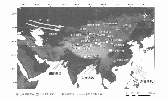 中纬度亚洲主要大气环流系统和气候研究点位置示意图(引自陈发虎等:《中纬度亚洲现代间冰期气候变化的“西风模式”讨论》,《地学前缘》,2009年第6期,第24页)