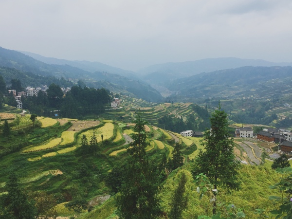 堂安侗寨的海拔是935米,肇兴侗寨的海拔410米,五百多米的海拔落差造就了这一路上的梯田景观。梯田和山峦间的石板路很明显,只要沿着石阶往下走基本不会迷路,单程徒步大约两小时左右。