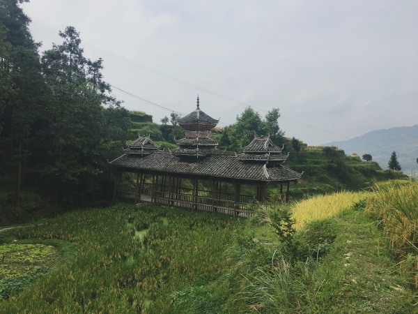 除鼓楼以外,风雨桥是侗寨的另一重要标志。风雨桥一般建在河边,高居大山的堂安因为没有河,所以堂安的风雨桥建在村寨下面的梯田里,虽然只是一个象征性的建筑,但那里也是堂安人劳作回家的必经之路。
