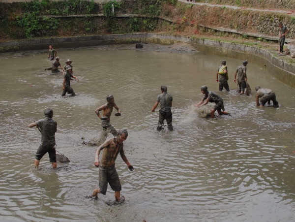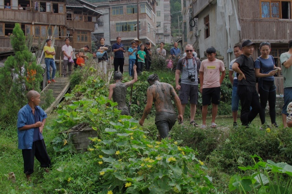 寨里的老人说,过去下塘捞鱼,打泥巴仗的有男有女,非常热闹。现在女的嫌脏都不愿下去了。年轻人很多在外面打工,泥塘里总共才20来人打泥巴仗,比起以前要逊色不少。