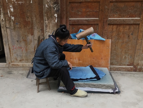 用木槌敲打靛蓝染色的侗布,是侗布制作的重要程序之一,也是在肇兴侗寨能经常看见的极富韵律的敲打。