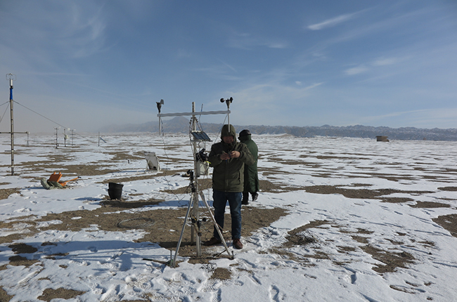 正好赶上窟顶治沙站的工作人员检修气象站,认识他们已近四年,除了定期采集数据,却很少了解他们的工作状态。我随口问了一句,你们在窟顶这么多年,每天往返一趟,这些路都是你们走出来的吧?邱飞有着敦煌人特有的憨厚,笑着告诉大家,鲁迅先生说,地上本没有路,走的人多了,也便成了路。为了保障办公室安全,不能使用大功率的取暖设备,房间温度勉强维持在十摄氏度左右,时而钻进门缝的寒风,只有一直不停地喝热水才能保持温度。李睿笑着说,幸好你不是早上来,不然你头发上该结冰了,早上骑着敞篷摩托车十几分钟上山顶,我们到中午吃饭的时候腿都是麻的,当然,没有什么是一根烟解决不了的。从下午一点开始,大家一直在戈壁安装、调试仪器,采集数据,不到几分钟我的脚就挪不动了,连续工作将近四个多小时,下午五点多,落山的太阳已然不再温暖,扶着仪器,我似乎都能听到手与金属分离的声音,第一次深刻地感受到生无可恋。邱飞说,这对他们来说,就是日常工作。