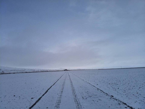 今年的寒冬,格外的冷。中午,只漏出眼睛,我把自己包裹的密不透风,沿着这条通向窟顶唯一的路,地上治沙站工作人员上山的交通工具—一辆小型“豪华”敞篷四轮车驶过的印迹清晰可见,这该是每天早上窟顶最耀眼的一抹亮色。
