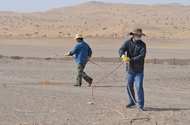 今年四月份,荒漠地区植被恢复区域极不受欢迎的鞘翅目拟步甲成虫在窟顶及窟区泛滥,拟步甲作为一种指示生物,景观、土壤、斑块化程度及人为活动等因素对其分布、行为和活动规律产生重要影响。拟步甲主要以窟顶固沙植物泡泡刺、梭梭、沙拐枣等沙生植被嫩芽为食,而且可迁徙至窟前栈道,不仅威胁文物安全,而且给游客参观造成不便。敦煌的四月,沙尘频发,给治沙站的日常监测工作带来了严重困扰,但这丝毫不影响四位工作人员根除害虫的决心。詹鸿涛说,他参加工作二十余年,每天看着这些植物的变化,就像看到了他自己,对它们有种莫名的感情,得知这次害虫爆发,他一刻都不容许自己怠慢,担心哪一棵幼苗从此再也不能生根发芽。这次治沙站员工全体出动,邱飞和詹鸿涛负责配置昆虫杀灭剂,李睿和蔺双虎负责喷洒,每天工作五小时左右,为期两周多,每个人身上都有一股浓浓的杀虫剂味,但虫害基本得到了控制,大家终于松了一口气。