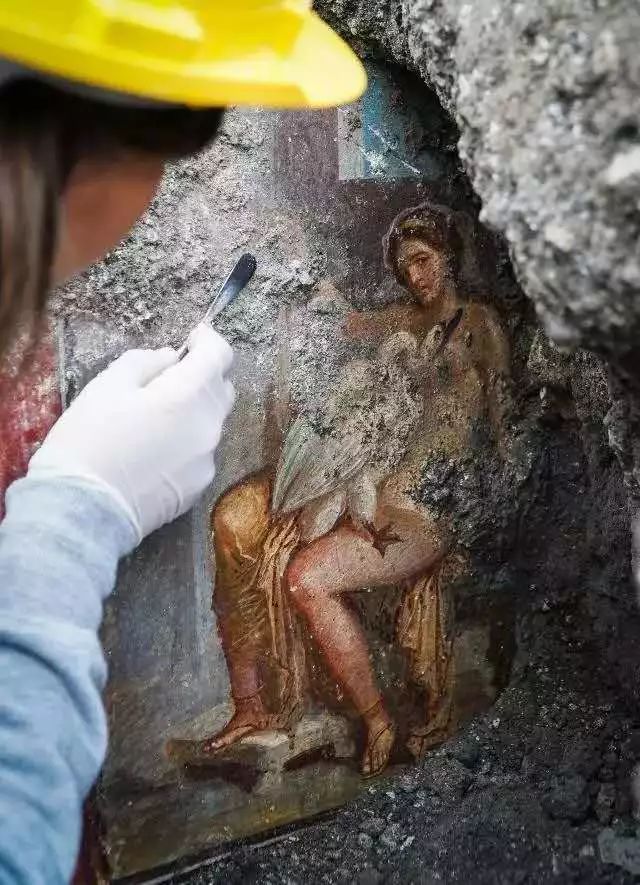 考古学家在今年发掘的意大利庞贝城卧室里发现了一幅“丽达与天鹅”的壁画,描绘了一个伪装成天鹅的罗马神朱庇特与希腊神话中性感的斯巴达传奇女王的动人故事。丽达在天鹅身上被神浸透的形象是庞贝古城里一个相当普遍的家居装饰主题。它被绘制成从任何角度看,都能感觉丽达在看着你的画面。