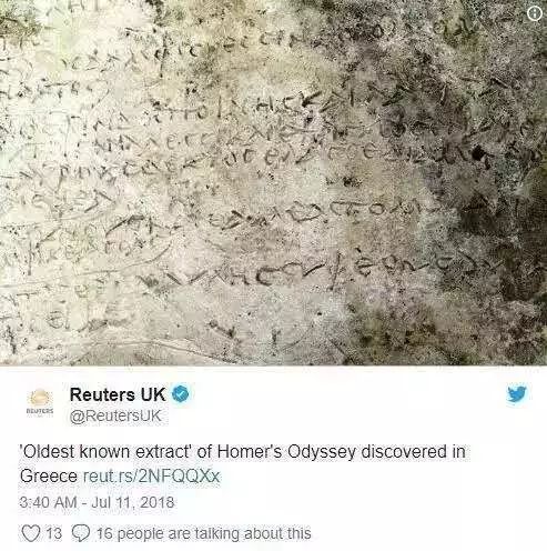 希腊和德国的考古学家在希腊最大的考古遗址之一——“奥林匹亚考古遗址”发掘出一件稀有而重要的文物,最早能追溯到公元三世纪的罗马帝国时期,刻有 13 节诗,是荷马史诗《奥德赛》的古代碑刻。这块石碑是希腊与德国考古团队经过三年合作,在靠近伯罗奔尼撒半岛西部、奥林匹亚的宙斯神庙遗址(Temple of Zeus)附近发现的。希腊文化和体育部对外宣传称“如果能够确认详细年份,那么它很可能就是现今所有挖掘文物中,最早以文字记载古希腊盲人诗人荷马作品的文献。”