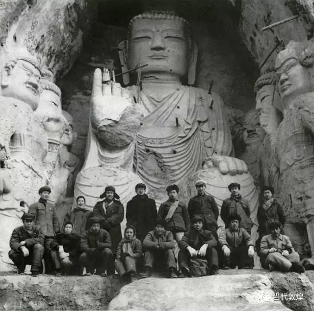 1959年12月4日,天梯山石窟勘察搬迁工作队部分队员和常书鸿队长在第13窟大佛前合影。前排左起:张学荣、李承仙、孙纪元、何静珍、张鲁章、倪思贤、窦占彪、任步云。后排左起:段文杰、万庚育、翟广炜、常书鸿、丁桂昌、赵之祥、李贞伯、孙儒僩