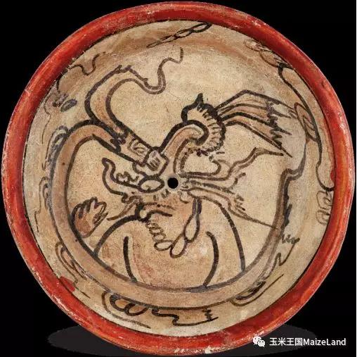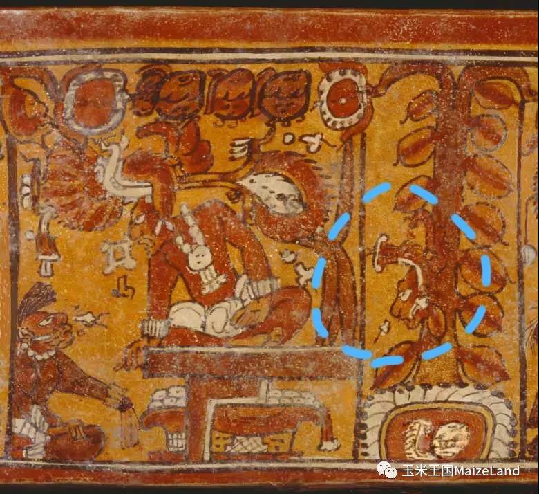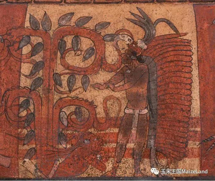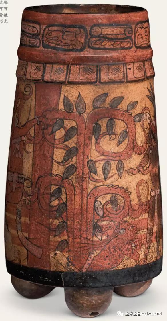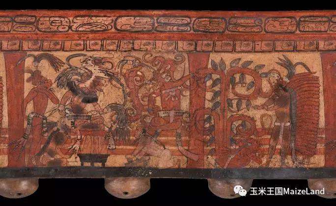 在站立者左边还有一个人似乎是趴在地上,而且,更为奇怪的是居然有一颗可可树从他的腰部长了出来!!!其实,这是玛雅人表现“转化”的一种方式。我们在很多彩绘或雕刻中都能看到“人”(有时是动物)化为“树”的场景,其中,大部分是玉米神化为“世界树”。比如,Kerr玛雅陶器数据库中收录了一件现藏于德国的三足器,上面就有玉米神化为“世界树”的场景,也有研究者认为是死去的国王化为某种树。