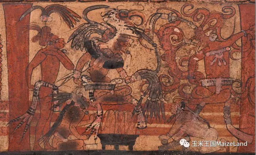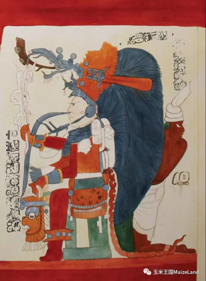 本身这个场景所描绘的应当是神居住的殿堂(一般说来,玛雅艺术中,向左坐着的人是画面的主角,也是场景的主人),能够进入神殿的人绝非普通人;其次,他身后背着插满羽毛的木架,这种装饰一般是国王才有。在危地马拉东南部一个名为“序尔顿”(Xultún)的遗址中发现了几幅壁画,其中就有一幅描绘了国王,其装饰与上述展品中站立者的装饰非常相似。
