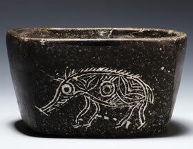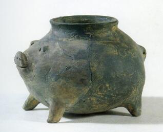 猪与人们的日常生活息息相关,因此古人亦将猪的形象绘刻于器物之上或融汇于器物之中,这无一不显示出先民非凡的审美情趣和超乎的想象力。浙江余姚河姆渡遗址出土的猪纹陶钵T243:235造型精美、绘画生动,陶钵高11.7、宽17.5、底边长15厘米,夹炭黑陶,平面成长方形,侈口,圆角,器表打磨光亮。长边两侧各刻一只猪纹图像。无独有偶,除了钵上的猪外,河姆渡遗址还出土了一件陶猪,长6.7、高4.2厘米,此陶猪腹部下垂,鬃毛突起,四足交替似作奔走状,造型生动传神、栩栩如生。
