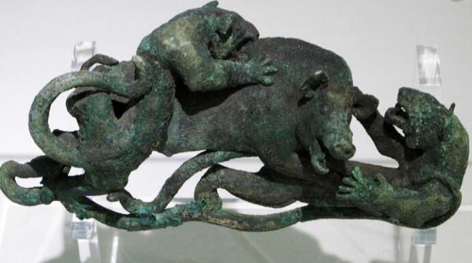 云贵高原气候湿润、植被茂密、适合动物栖息繁殖,远在西南夷的古滇国中几件出土文物上的兽斗场面便生动地反映出当时人类所处的险恶环境。云南晋宁石寨山墓地出土二豹噬猪铜扣饰M10:4,青铜铸高浮雕,背面有一榫扣装置,扣饰上的野猪作张口嘶叫状。一豹扑于猪背,咬住其颈部;另一豹虽被野猪冲倒在地,但仍回首张口,高举前爪作反攻状。其下有一蛇,口咬野猪后腿,尾绕一豹左肩。除了这件铜扣饰外,还有一件鎏金二豹噬猪铜扣饰,不过这回豹子可没得着便宜,一只豹子的腿被野猪噙于嘴中死咬不放。