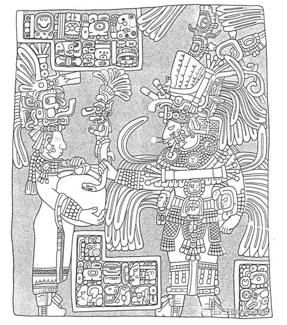 玛雅国王雕像的常见场景就是国王手持卡威尔神权杖。比如雅什齐兰(Yaxchilan)遗址第53号门楣雕刻上,盾牌美洲豹王(Shield Jaguar)就是右手持卡威尔神雕像的蛇足与怀抱神圣包裹的王后主持仪式。