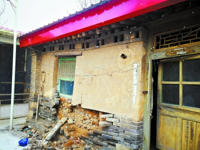 打开曹宏家的大门,沧桑感扑面而来。西厢房窗户下的部分已经坍塌,露出了内部的土坯子和半头砖,“您留神!”曹宏很怕房子突然塌掉。记者透过门缝看到,房子的主梁已经断裂,后墙上也有个大口子,墙皮更是不复存在,地上的灰尘足有好几寸。“这房子建于清末,已经不能住人了。好在去年加了铁皮顶,平安度过了汛期,没倒塌。”院内三间正房也同样是低矮破旧,房顶只有两米多高,“我今年50岁了,就是在这房子里出生的,还得管它叫声哥。”曹宏打趣道,“马上就搬迁了,老房子也没有修的必要了,留着钱给新家装修吧。”