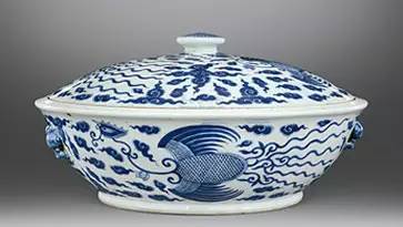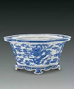 元青花跟其他瓷器的题材表现不一样,它的题材尤其多,有花卉、鱼藻、翎毛走兽、龙凤、人物,什么都画。元青花早期的题材大致都是花卉、翎毛走兽、龙凤,后期出现了大量戏剧故事,画人物。4造型硕大