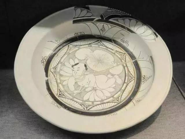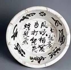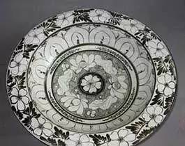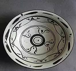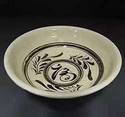 白地黑花有碗、盘、罐、瓶、枕等,以碗、盆为多。大的在40——50厘米之间,小的与白釉中的Ⅲ、Ⅳ式碗大体相当,还有一种碗为唇口卷边,腹壁斜直,平底卧足,外部露胎,施半釉,造型别致。碗心多绘有花草文字,有支砂痕。小型碗,外多施半截白釉,在口外边或内边加绘黑色宽边线一圈或细圈线两周。底足露胎,圈足宽厚。盆:板沿,平底,内部施满釉,外部多露灰黄色胎,有的挂黑色、蓝色釉,盆内和盆沿多绘莲瓣、荷花、水纹、鱼藻、花草或在盆中心书一"盆"字。口径多在40厘米以上。2黑釉天目瓷