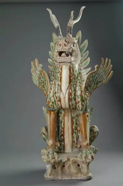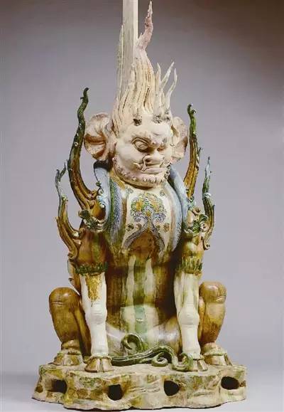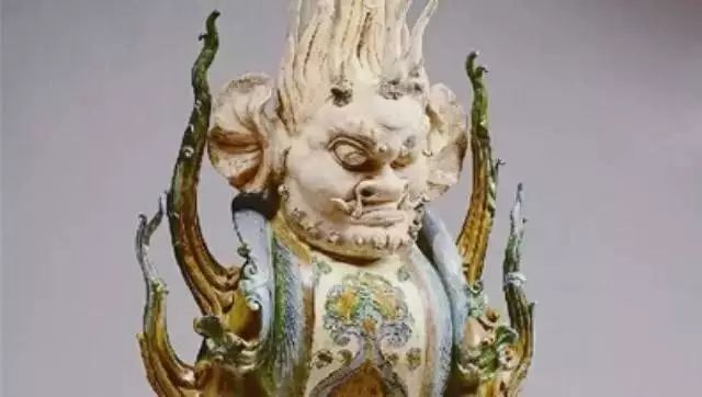 上图这件镇墓兽,出自唐代,高110厘米,1992年在洛阳孟津出土,现藏于洛阳博物馆。唐代雕匠师以夸张的手法,把镇墓兽凶煞气势表现得林漓尽致。这件镇墓兽通身间施黄、白、绿三色釉,兽首,张口露齿,头生二弯曲尖角,大耳高竖,两侧有树叶状羽翼,鹰爪,这种集多种动物之长于一体的理想代造型,把镇墓兽那满无比威严,孕含着无穷活力的神韵发挥到了极致,充分显示出艺术匠师们丰富的艺术想像和娴熟的艺术表现力。