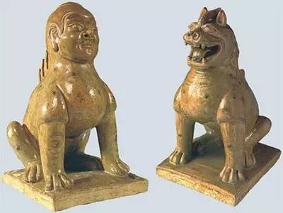 《周礼》中曾记载有一种怪物叫魍象,好吃死人肝脑;又有一种神兽叫方相氏,有驱逐魍象的本领,所以人们常令方相氏立于墓侧,以防怪物的侵扰。所以有学者认为,使用镇墓兽的习俗,就是从“方相氏”的传说演化而来的,其主要兴盛于魏晋至隋唐时期。镇墓兽起初造型简单,越往后造型越是复杂,而面目狰狞则是大多数镇墓兽都具备的样貌。