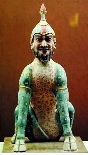 上图这件镇墓兽,是从阿斯塔那224号墓地出土的,现由新疆自治区博物馆收藏。这件镇墓兽为人首,戴头盔,形似武士,双目圆睁,嘴唇上部和下颌部蓄有浓须,身体似豹,足如马蹄。全身以浅蓝色为底,上用黑、蓝、白勾勒出豹斑圆点,尾部细长,宛如一条长蛇。整体造型流畅,极富动感。这件雕塑人和动物形象有机结合,面部采用写实手法,生动地表现出保护墓主人安宁而设置的辟邪守护神之形,达到了生动逼真的意境。