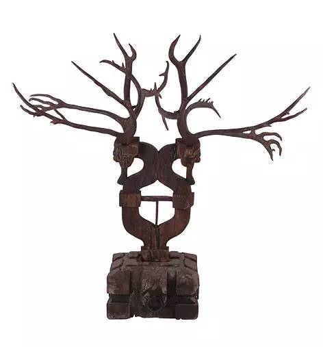 上图这件镇墓兽,出自战国时期,1978年湖北江陵天星观1号墓出土,高170厘米,现藏于荆州博物馆。这件镇墓兽由实心方木底座,兽头和两对鹿角组成。背向的两只兽头曲颈相连,雕成变形龙面,巨眼圆睁,长舌至颈。鹿角向两翼张开,气势雄伟,增加了镇墓兽的神秘感。这只镇墓兽的造型,很可能与身披熊皮,头套面具,执戈举盾,驱逐鬼怪的方相氏有关。镇墓兽的头上安装的鹿角被认为是具有某种神异之力,对死者在冥界生活可以起到保护作用。这种镇墓兽一开始在楚地出现,后来向外流传,各地随之都出现了镇墓神物,五代以后逐渐消失。