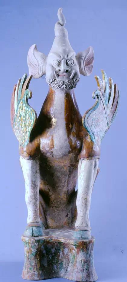 这件非常罕见的镇墓兽,系台湾历史博物馆于2001年所购藏,体型硕大,可谓空前。这件镇墓兽为人面兽身,凸睛竖眉,獠牙外突,山羊胡,下巴至两耳皆生胡须。面容狰狞,头顶生尖形高角一只,附小支角,兽面两侧各生扇形大耳,双肩生翅,左右各二。胸腋有图案,缀卷草纹饰,足呈牛蹄,作蹲踞状,尾巴盘在四肢当中,背部塑四短状锯齿形脊饰,并附一利刃突出,造型独特。身施以黄、褐、绿三色釉,并加蓝彩。头部及前足未施釉,但有绘彩痕迹。台座前后有六孔便于缚扎。制作精细、表情威猛,极具震摄的雄姿,庄严可畏。