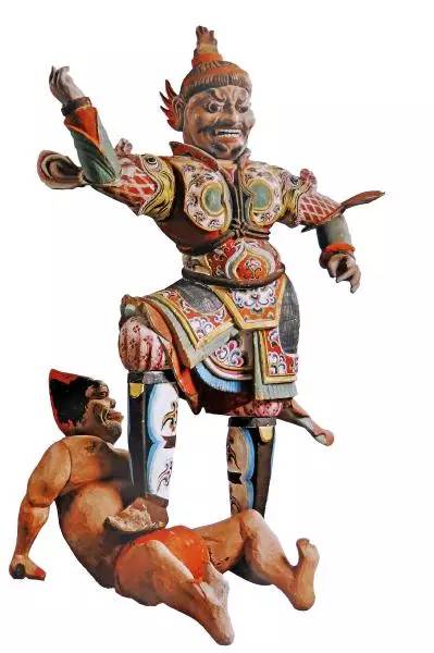上图这件镇墓兽,出自唐代,1973年新疆吐鲁番阿斯塔那墓葬出土,现藏于新疆维吾尔自治区博物馆。这件镇墓兽由三十余块大小不等的上好木料分段雕琢出大至躯体、小到牙齿等部位,然后加以粘合成型,最后用红、黄、白、绿、黑、紫等彩色描绘表面。其外观形象来源于佛教造像中的护法天王像。天王踏鬼木俑让人们看到了中原文化对西域的浓重影响,这个天王,一身中原武将的“时装”,不经意地露出的裤腿和夹衣袖子却是明明白白的西域花纹,两种文化就这样自然亲密地融合在一起。