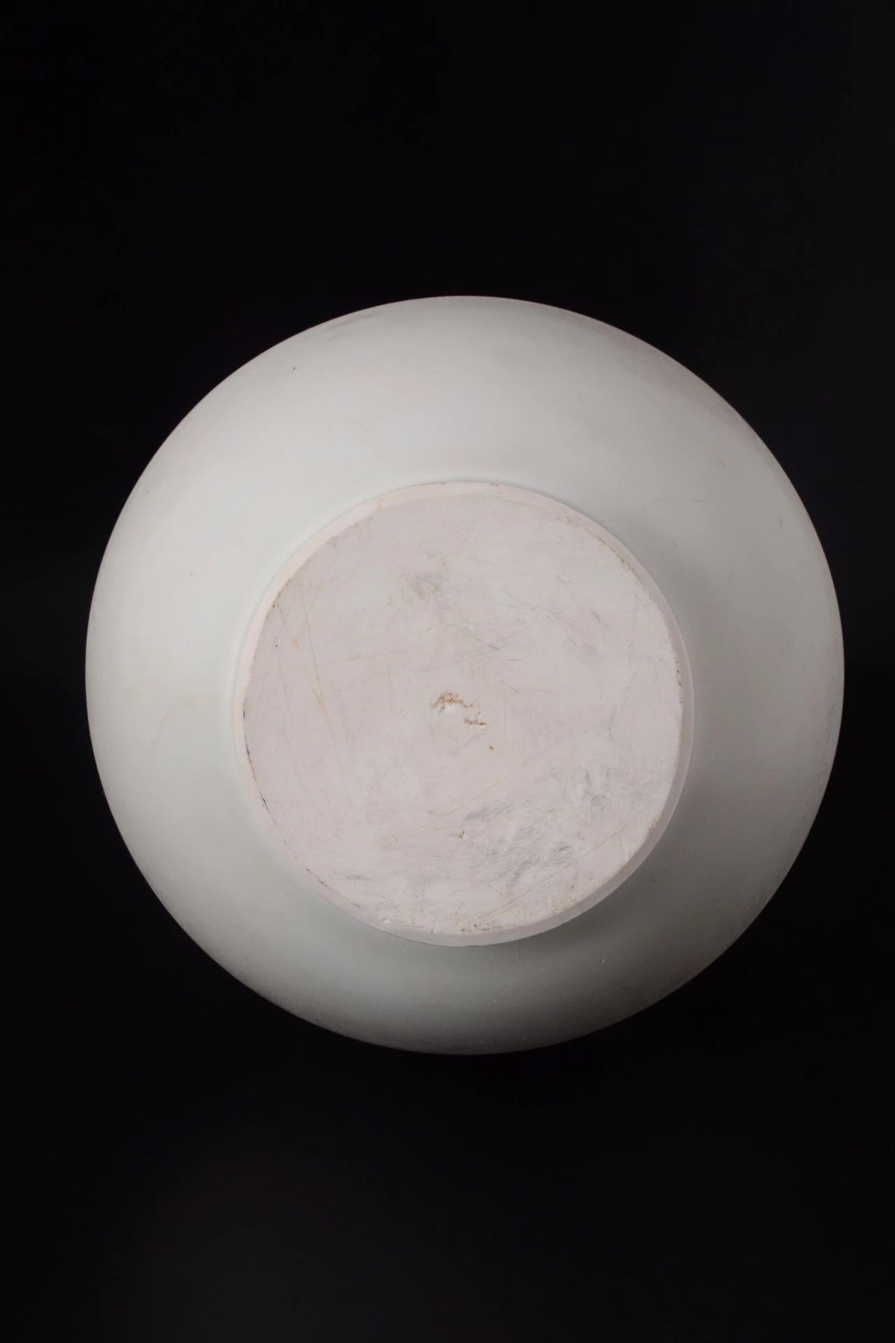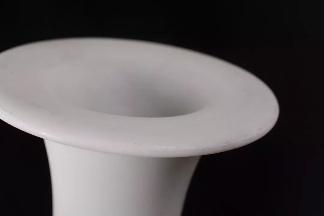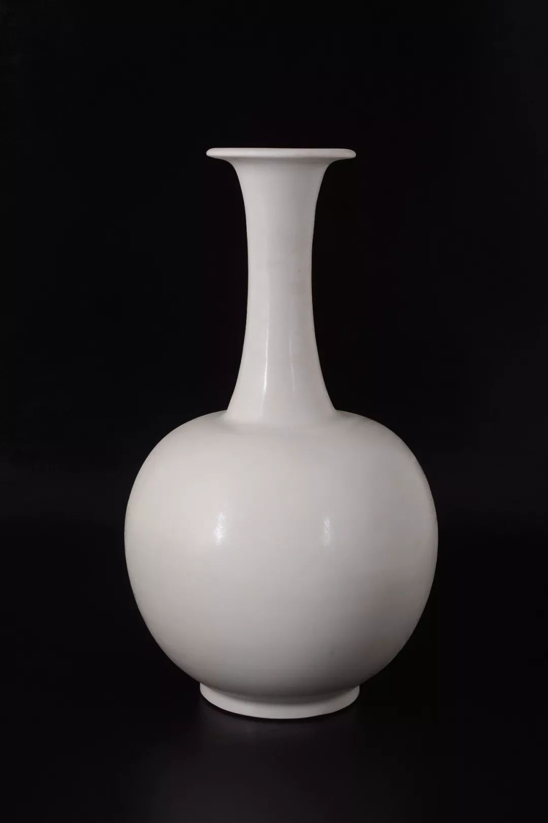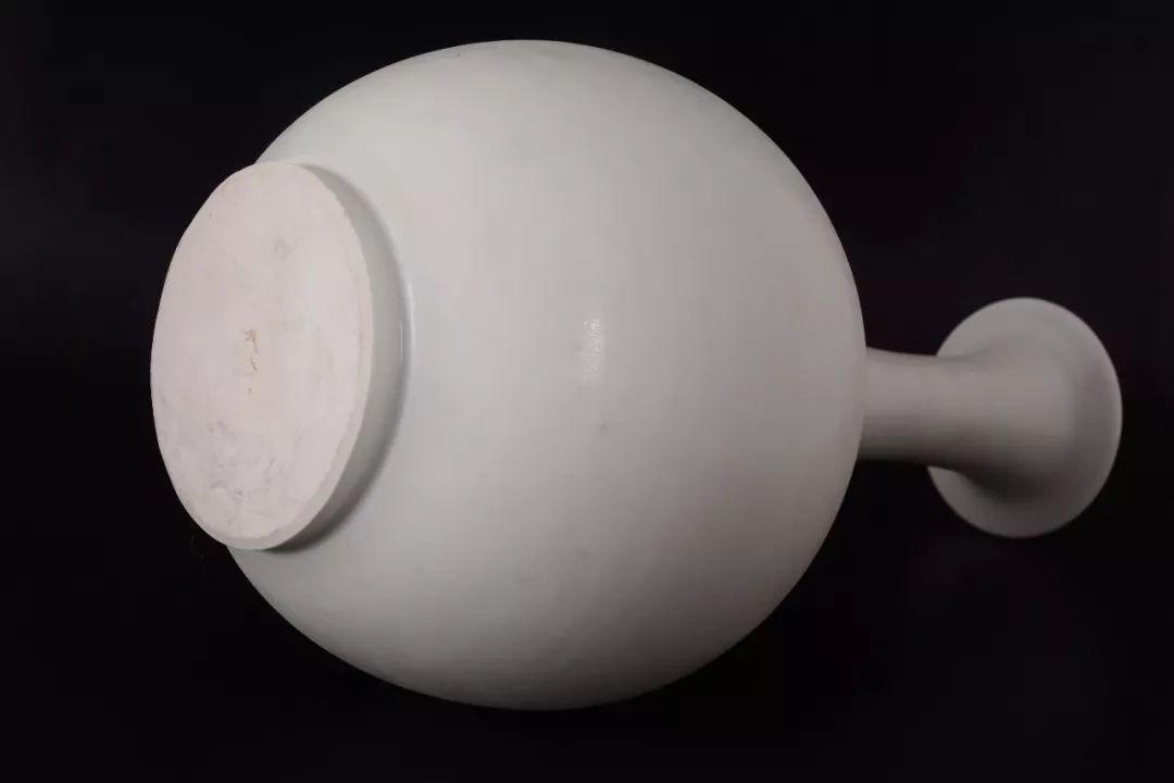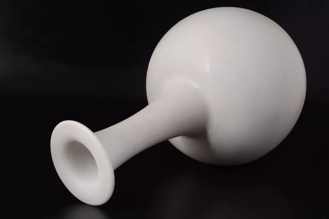 此拍品为邢窑精品,器物广口,长颈,鼓腹,下承小平底足,造型浑圆饱满,品相完整。器内外均施白釉,釉质凝厚莹润,施釉均匀,釉色洁白明净,如和田羊脂玉,体现了盛唐素器风行的瓷器审美。器底无釉,露出白色胎土,可见胎质坚实,细腻无杂质。