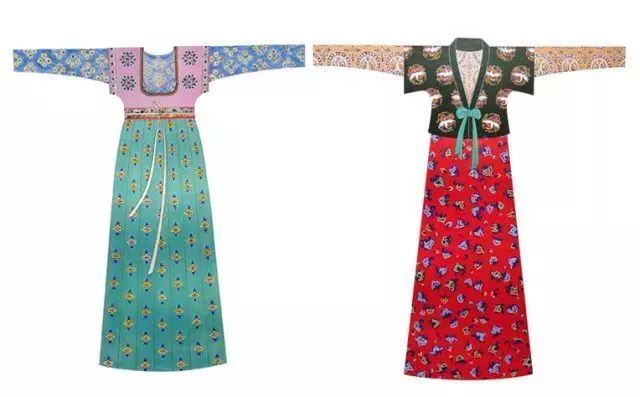 早在高宗时,女子喜欢穿长裙来展示身姿窈窕,讲究“坐时衣带萦纤草,行即裙裾扫落梅”的美感。长裙不但要长,裙幅还要大,唐代女子的长裙一般是六幅布帛制成,而有的长裙达到七、八幅,更华丽的可至十二幅。还有别出心裁的裥裙——两色布匹分别裁成上窄下宽的“长梯形”,再间隔缝制而成的长裙。