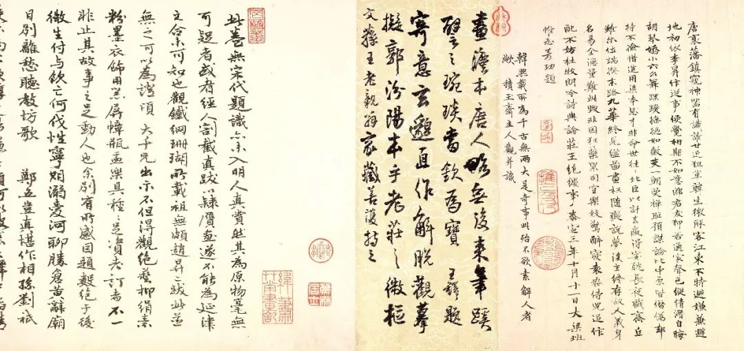 此《韩熙载夜宴图》卷为五代画家顾闳中作。图卷描绘了官员韩熙载家设夜宴载歌行乐的场面:宴罢聆听、击鼓伴舞、画屏小憩、玉人清吹、夜阑余兴,每段用屏风作为场景分割,整幅作品线条遒劲流畅,工整精细,构图富有想象力。此卷为绢本设色,现藏于故宫博物院,应属南宋摹本。