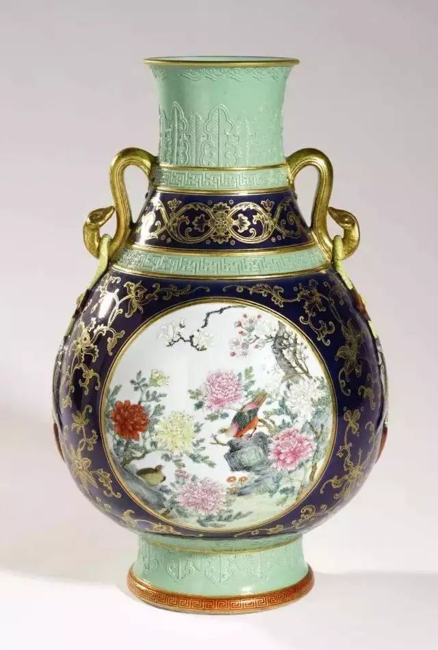 第十名:霁蓝描金开光粉彩花卉纹双耳瓶