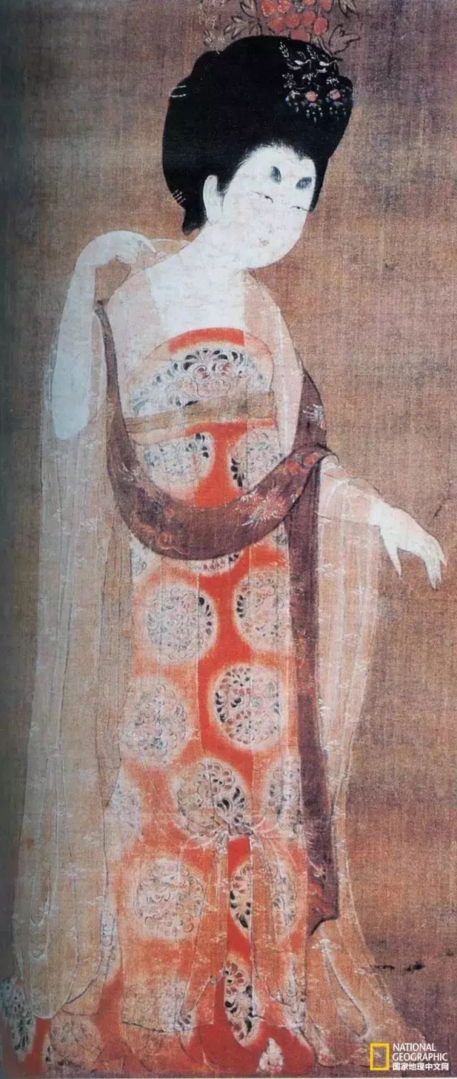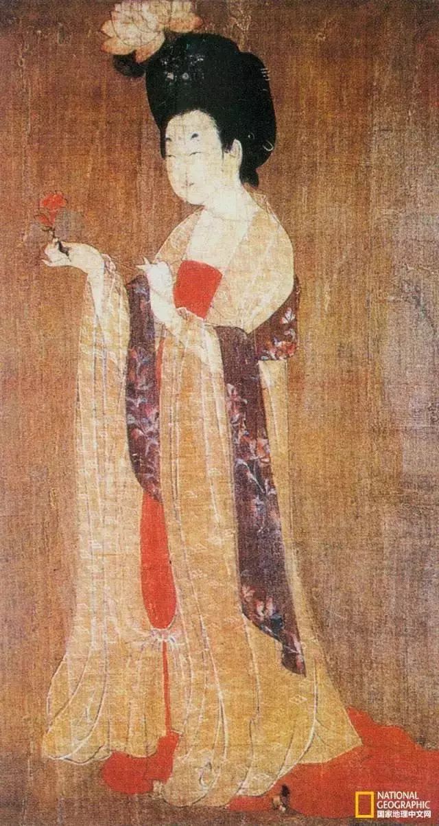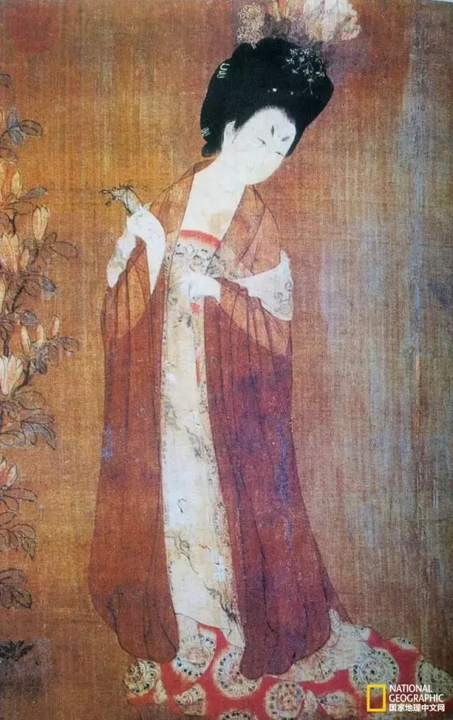 唐代国风开放,女子的社会地位和活动空间有极大提高,着装风气也开先河,以袒颈露胸为时尚。