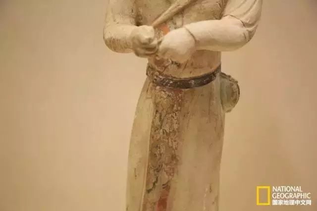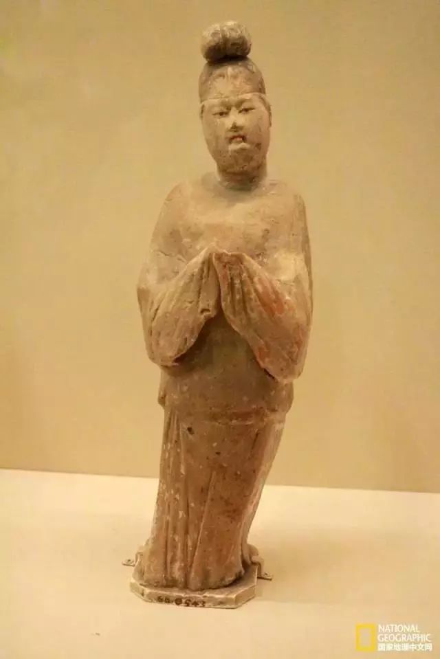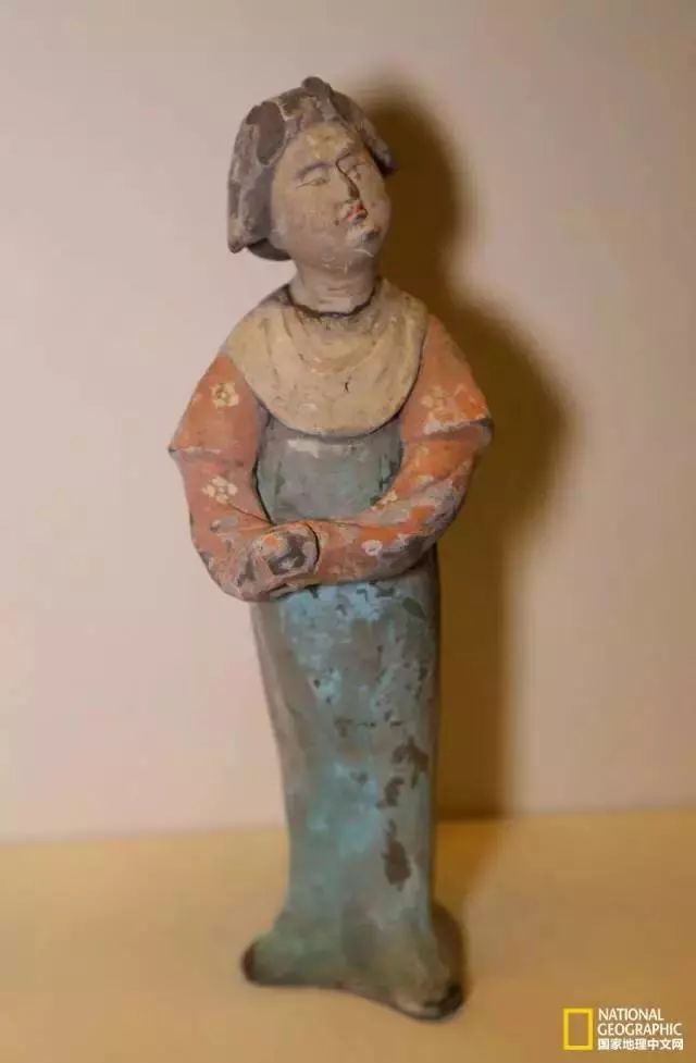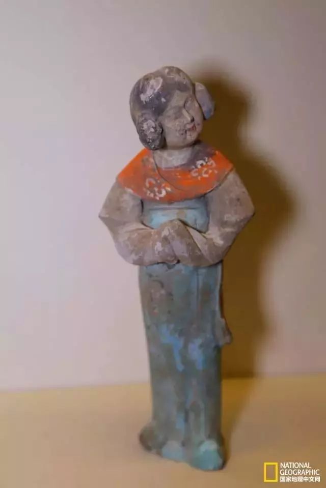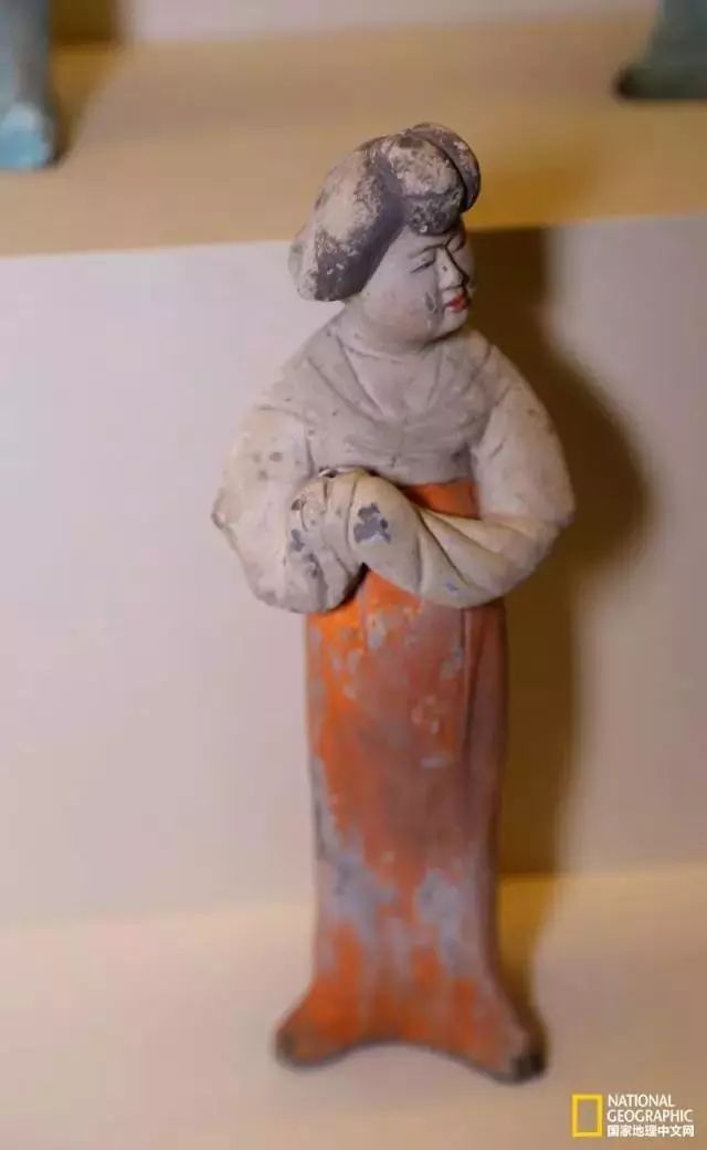 其形象如陕西省西安市郭家滩出土彩绘陶男装女立俑,该女俑头戴幞头,身穿圆领袍,腰系銙带,典型的唐代男子装束,即唐诗中“军妆宫娥扫蛾浅”(李贺《十二月乐辞·三月》)、“辇前才人带弓箭”(杜甫《哀江头》)、“空教女子爱军装”(司空图《剑器》)的风采。