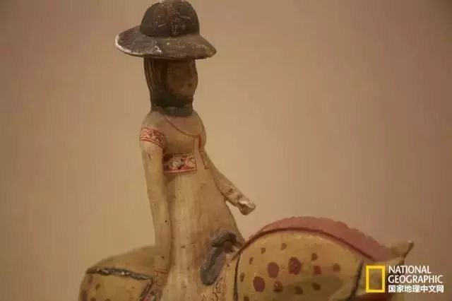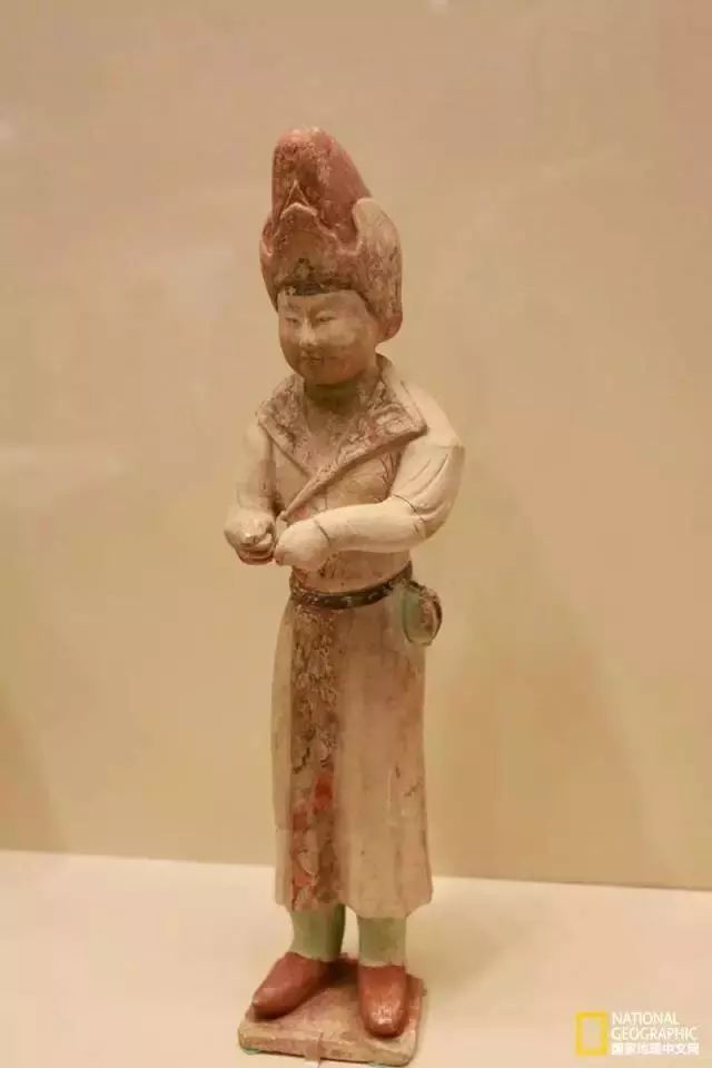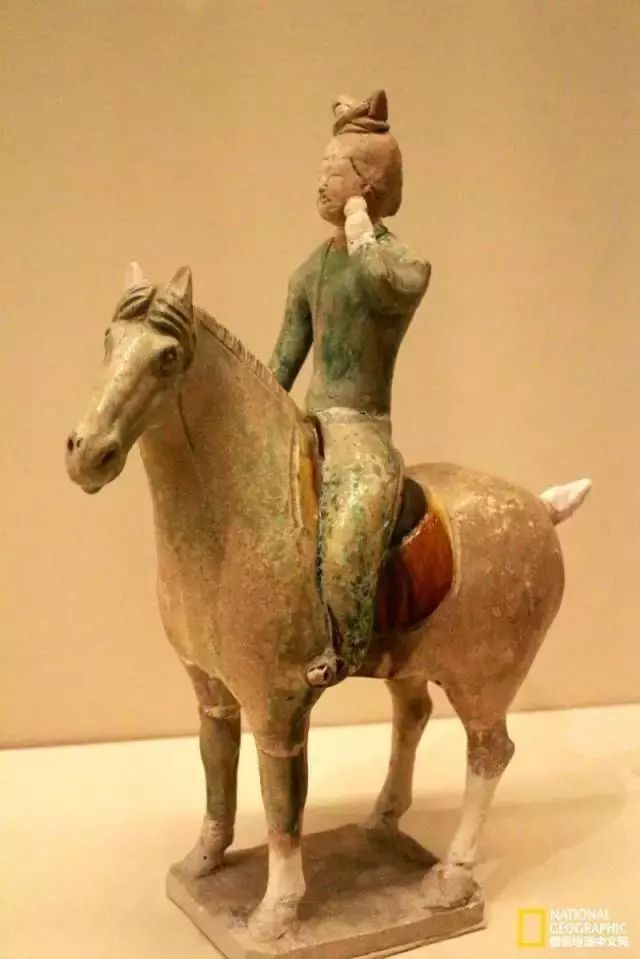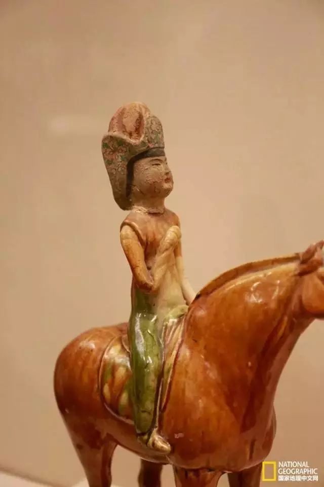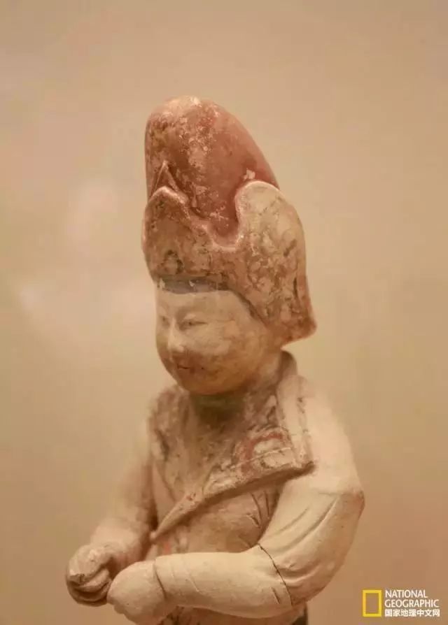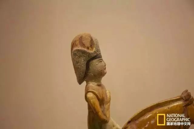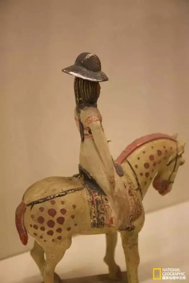 诗中所说的“卷檐虚帽”就是一种男女通用的胡帽,锦、毡、皮缝合而成,顶部高耸,帽檐部分向上翻卷,如彩绘陶戴帷帽骑马女俑。