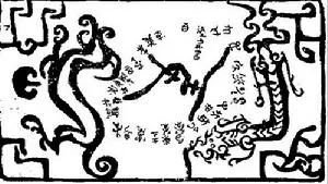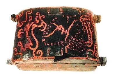 两侧面,一面绘两兽对峙、卷云纹、星点纹,另一面无花纹。衣箱盖面两边分别绘有象征东方的青龙与象征西方的白虎形象,中央是一个象征北斗星的“斗”字,周围环绕着“二十八星宿”,其与《史记·天官书》中的“二十八星宿”名称基本相同,在“阮宿”之下还注有“甲寅三日”。