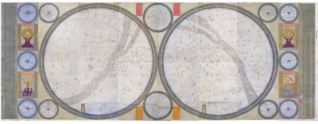 《赤道南北两总星图》现存于中国第一历史档案馆,为木印彩绘纸本,蓝绫宫裱,由8条幅纵向拼组而成,全图版框高171.5厘米,宽452厘米。