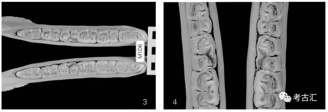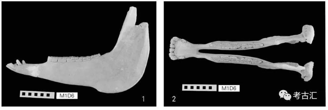 标本M1D6是一件较完整的下颌骨,从具有下犬齿来看,是一个雄性个体。马衔磨蚀痕迹出现在左、右两侧的第一下臼齿的舌侧,其靠前部分垂直下凹,这部分的齿质和珐琅质都有缺失(图2:1-4)。