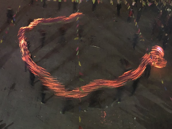 19点30分,宫庙内礼乐声大作,庙外火盆正旺,鞭炮四起,震耳欲聋,龙身方始起动。在民间传说里,火能驱邪避凶,也寓意红红火火,对于这个传承自北宋年间的风俗,作为外来者的我们更多怀着猎奇,看青壮年男子们一拥而上,将拇指粗的贡香一根根点燃并均匀插满龙身。看香龙尾随在同样插满贡香的龙珠后,或高举或低回,绕村而行。