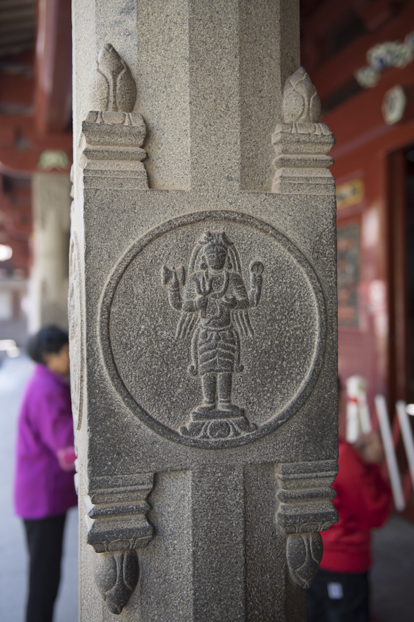 这样一片古木森然之中,一不留神就会错过大雄宝殿前拜坛须弥座束腰部那73方印度教人面狮身青石浮雕。它们离地只三四十厘米,要想看清楚,须得完全蹲下来。这一只毛发蓬松、四足立地,那一只头盘三层螺髻双耳垂肩,右脚还持有一朵莲花……经过时光冲洗,这些浮雕大多已经面目模糊,你甚至可以伸手抚摸那些不甚清晰的线条,用手指勾勒它们的轮廓。
