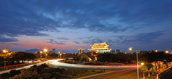 富美宫旁边是晋江,宽阔又平缓的河流在夕阳的暖光下静静流淌。从它的名字可以猜出它被命名的年代,正好是陶渊明所处的东晋。从富美宫出发,步行约1公里左右可抵灯荣路与田安南路交叉路口,此地称御淮古地,供奉守护渔民出海作业的“玄天上帝”。时值傍晚时分,宫庙内丝竹之声不绝于耳,大门前一只通体发光的紫红色巨型充气拱门在夜幕下格外夺目。