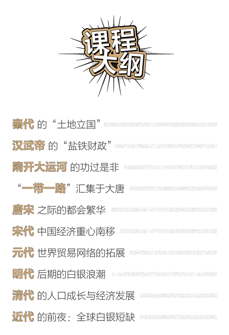 我们也谈了大运河的修造,这里其实有一个环境、资源分布与经济发展之间的关系;我们还讨论了一带一路和元代的贸易网络,这都涉及交通以及交易成本对于经济发展的影响;在讨论中国经济重心转移到南方这一部分,则是考虑到资源禀赋、新技术等对于经济的影响;最后3讲中,我们则是重点考察了人口和货币这两个重要因素对于经济的影响。