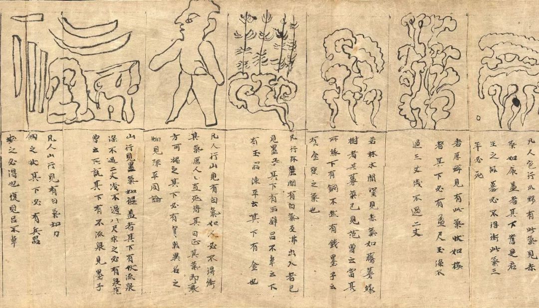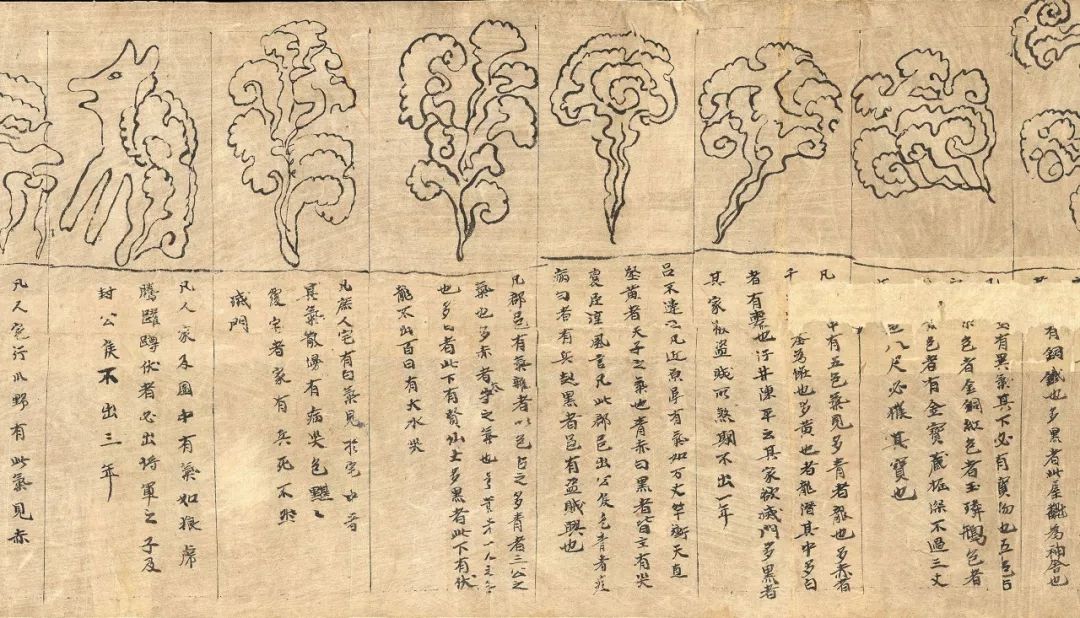 此卷子前为《气象杂占》,后为《解梦及电经一卷》,星图居中。绘制者用不同的颜色区分了甘、石、巫三家星官。《敦煌星图》的注释中有「臣淳風言」的字样,说明这位杰出的道家数学家、天文家和历史学家曾参与制作。