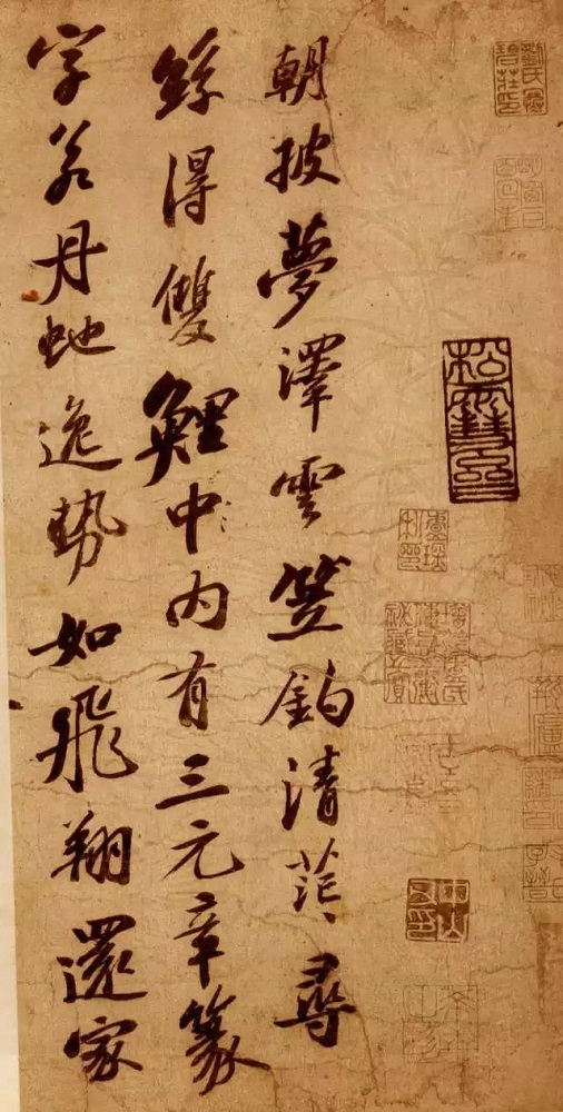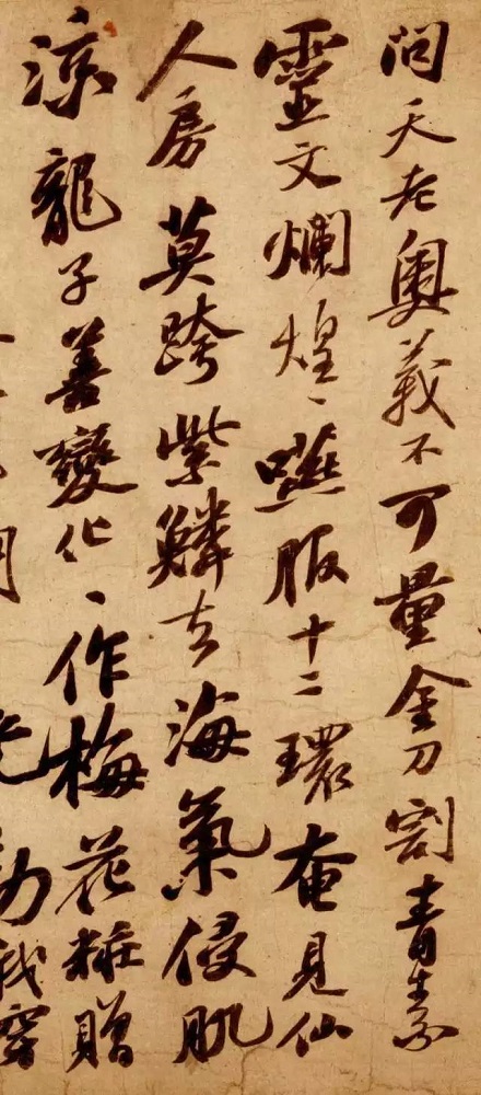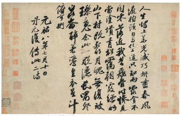 这一手卷落款为“元祐八年七月十日,丹元复传此二诗”,没有署名,但一看就是苏轼典型的书风。这两首李白诗,在李白的正集中没有收入,估计苏轼当时也没有读到过,所以欣然择上好佳纸写录。查上海古籍出版社瞿蜕园、朱金城校注《李白集校注》,此二诗收入卷三十“诗文补遗”,题为“上清宝鼎诗二首”,即录自此卷东坡墨迹。然而,中华书局孔凡礼整理点校之《苏轼文集》题跋卷中“记太白诗二首”,文字与此墨迹本基本相同,但也颇有不少出入。比如将“朝披梦泽云”写作“朝披云梦泽”等,显然不大贴切。