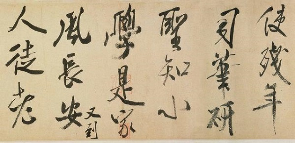 黄庭坚也有两卷,永青文库所藏的《行书伏波神祠诗卷》也因展品轮休而不幸错过,但著名的《草书李太白忆旧游诗卷》则赫然在目。此卷为京都有邻馆珍藏,纵横恣肆的笔意,跌宕多姿。可惜此卷品相稍疲,有些字磨损厉害,否则其精神当更加灿烂焕发。