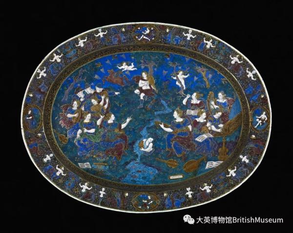 这件精美铜胎画珐琅盘制作于1600年左右的欧洲。其特别之处在于,它出自于一名女性工匠之手。我们可以在盘子找到她的名字——苏珊娜·考特(Susanne Court)。苏珊娜出身于法国里蒙(Limoges)的考特家族,这个家族世代经营着珐琅工作坊,以其精湛的画珐琅工艺而闻名。这件珐琅盘描绘了阿波罗和缪斯女神在赫利孔山的情景,其对奏乐女神的细致描绘,宝石般的色泽以及华美的鎏金装饰,无不彰显了制作者精湛的技艺。