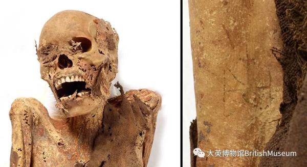 女性木乃伊(左)及纹身细节(右),苏丹,约公元700年