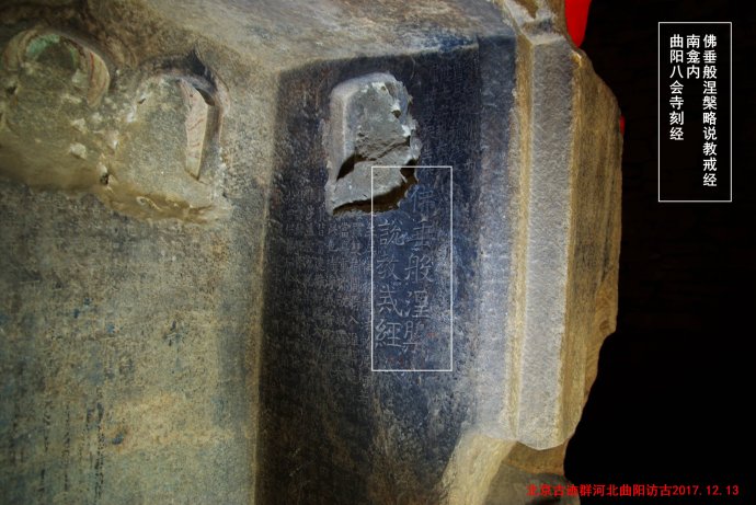 关于八会寺刻经的佛教意义很难懂,和北京古迹群一起到过河南安阳小南海石窟刻经(556年),宝泉寺大住圣窟刻经(589年),河北涉县娲皇宫石窟最大规模的刻经(550-577年),响堂山刻经窟(568-572年),山东东平洪顶山摩崖刻经(564年),等等,这是早期佛教刻经的发源地,刘建华老师在文章中说,有一条佛教刻经北传的路线,就是由当时佛教中心向北传播至北京的云居寺,形成云居寺石经山世界最大的佛教石经储藏基地,八会寺石佛龛是这条路线衔接刻经原点和石经山藏经洞刻经的重要环节,算是这条路线仅存的刻经遗迹,承载着刻经传承路线的辅助证据。曲阳地区石刻技艺历史悠久,故宫专门珍藏了一批曲阳白石佛造像,代表着曲阳石材和雕刻技艺的崇高地位,古代选在曲阳刻经也是正常的选择,可惜,在曲阳当地没有留下出色的摩崖石刻的作品,而真正的佛教刻经成就地点远在北京的石经山,曲阳则成为著名的商业建筑的石刻之乡。