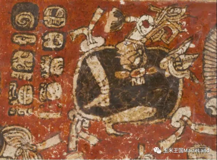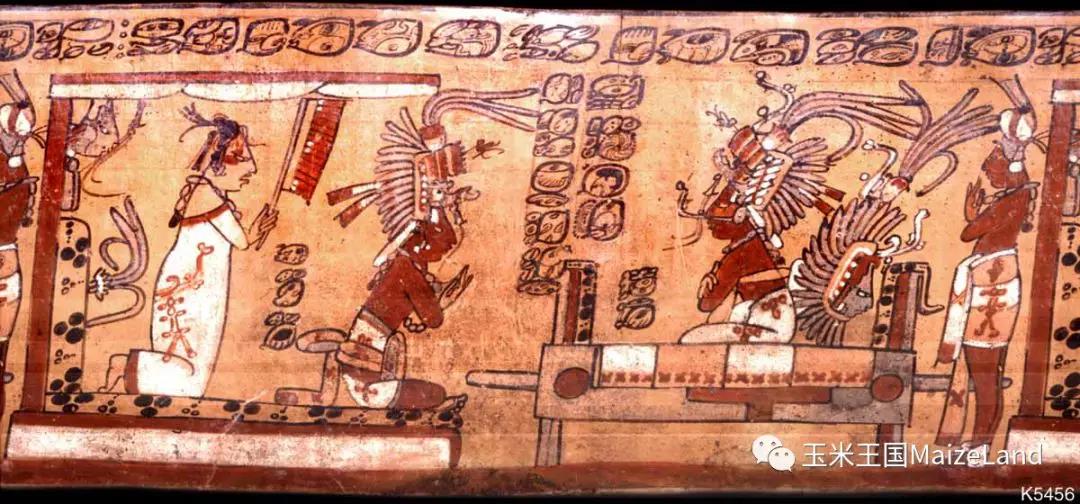 画面正中是玉米神孪生兄弟(也可能是玉米神的儿子英雄孪生兄弟)和两位冥界死神。玉米神兄弟以王者的交叉腿之姿端坐在两侧的步辇(litter)宝座之上,充满胜利者的快意。日常步辇较简单,这种有华盖和背板的步辇是王者的重要仪仗,常在战争场面出现。两乘步辇分别以骷髅和人头为饰,表现出冥界的主题。